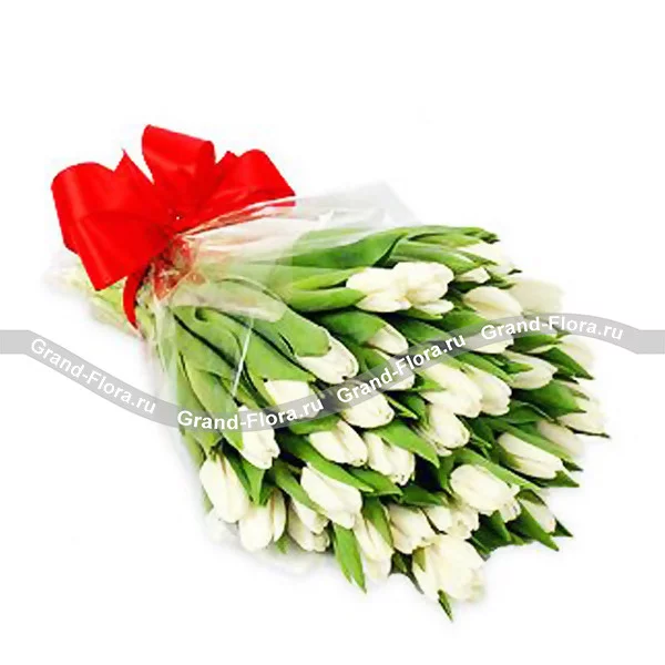 Белоснежные тюльпаны, окутанные прозрачной упаковкой и перевязанные красным бантом – это романтический подарок для нежной и утонченной особы.