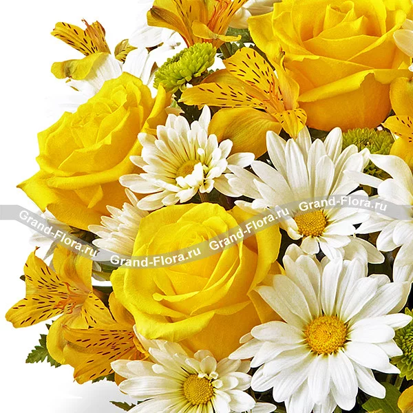 Люкс: роза желтая - 7 шт., хризантема белая кустовая - 3 шт., хризантема зеленая (сантини) - 3 шт., альстромерия желтая - 4 шт., папоротник - 3 шт., упаковка. Примерный размер: 30Х30 см.