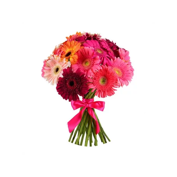 Стандартный: гербера разноцветная (бордовая, красная, розовая, оранжевая) - 11 шт., бант розовый.