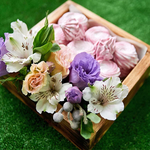 Стандартный: альстромерия белая - 1 шт., эустома фиолетовая - 1 шт., эустома персиковая -  1 шт., зефир, декор, оазис, деревянная коробка.
