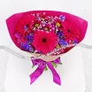 Уменьшенный: гербера малиновая - 1 шт., тюльпан фиолетовый - 3 шт., хризантема кустовая фиолетовая - 2 шт., эустома розовая - 1 шт., статица., упаковка, лента. Примерный размер: 25Х25 см.